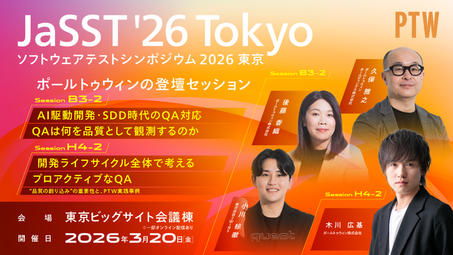 ポールトゥウィン、国内最大級のソフトウェアテスト技術カンファレンス「JaSST'26 Tokyo」に登壇 ―AI駆動開発時代のQAをテーマに2セッションを講演―