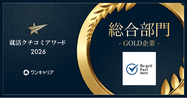 株式会社Re-grit Partners(本社:東京都港区、代表取締役CEO:山木智史、以下「リグリットパートナーズ」)は、就活支援サービス「ワンキャリア」を運営する株式会社ワンキャリア(本社:東京都渋谷区、代表取締役社長 執行役員CEO:宮下 尚之)が主催する「ワンキャリア 就活クチコミアワード2026」において、最高評価であるGOLDを総合部門および特別部門(ベンチャーランキング)で受賞し、総合ランキングでは約5万社の中で1位を獲得しました。