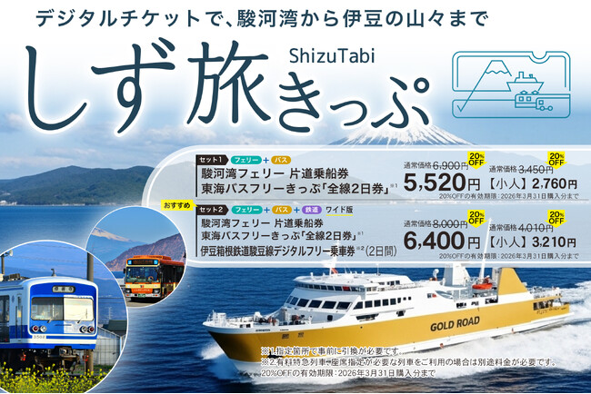 デジタルチケットの第1段として、駿河湾フェリー、東海バス、伊豆箱根鉄道の環駿河湾地域の交通機関の乗車券等がセットになった「しず旅きっぷ」を販売します。