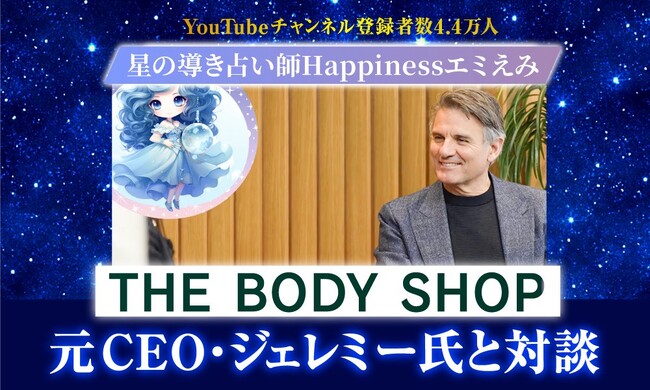 - 星の導き占い師・Happinessエミえみ、THE BODY SHOP(ザ・ボディショップ)元CEO・ジェレミー・シュワルツ氏と対談03/17 21:15