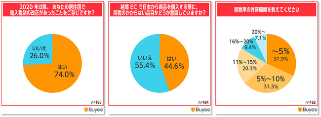 BEENOS株式会社(本社:東京都品川区、代表取締役:直井聖太、以下BEENOS)は、海外向け購入サポートサービス「Buyee(バイイー)」を利用される海外のお客様185名に「越境ECと関税に関する意識調査」を実施しました。