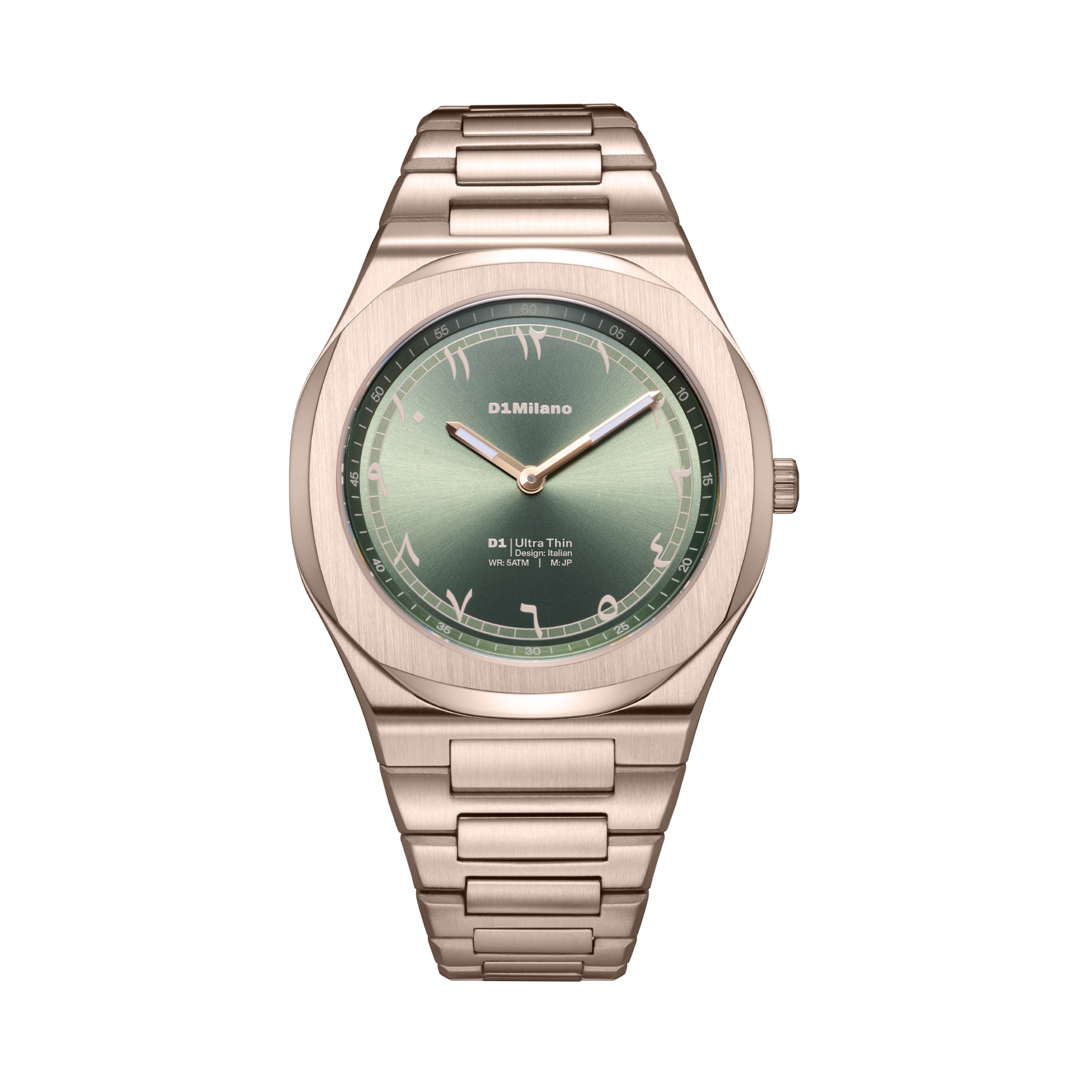 深みのあるオリーブグリーンダイヤルに、外周へ配置したアラビア数字モチーフを組み合わせたデザイン。ミニマルなフェイスの中にさりげないアクセントを加え、静かな存在感を演出します。ゴールドトーンのケースとの組み合わせにより、クラシックすぎないモダンなバランスに仕上げています。
