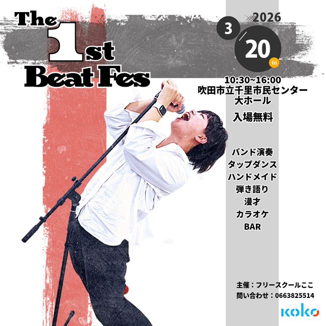 NPO法人ここ(事務所:大阪府吹田市、理事長:三科元明)は、2026年3月20日(金)に吹田市立千里市民センター大ホール(大阪府吹田市津雲台1丁目2−1 2階)にて、音楽フェス「The 1st Beat Fes vol.5」を開催します。