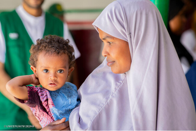 保健センターで重度の急性栄養不良と診断されたが、治療を受けて回復しつつある生後11カ月のサジャちゃん(ソマリア、2025年4月22日撮影) (C) UNICEF/UNI791262/Hill