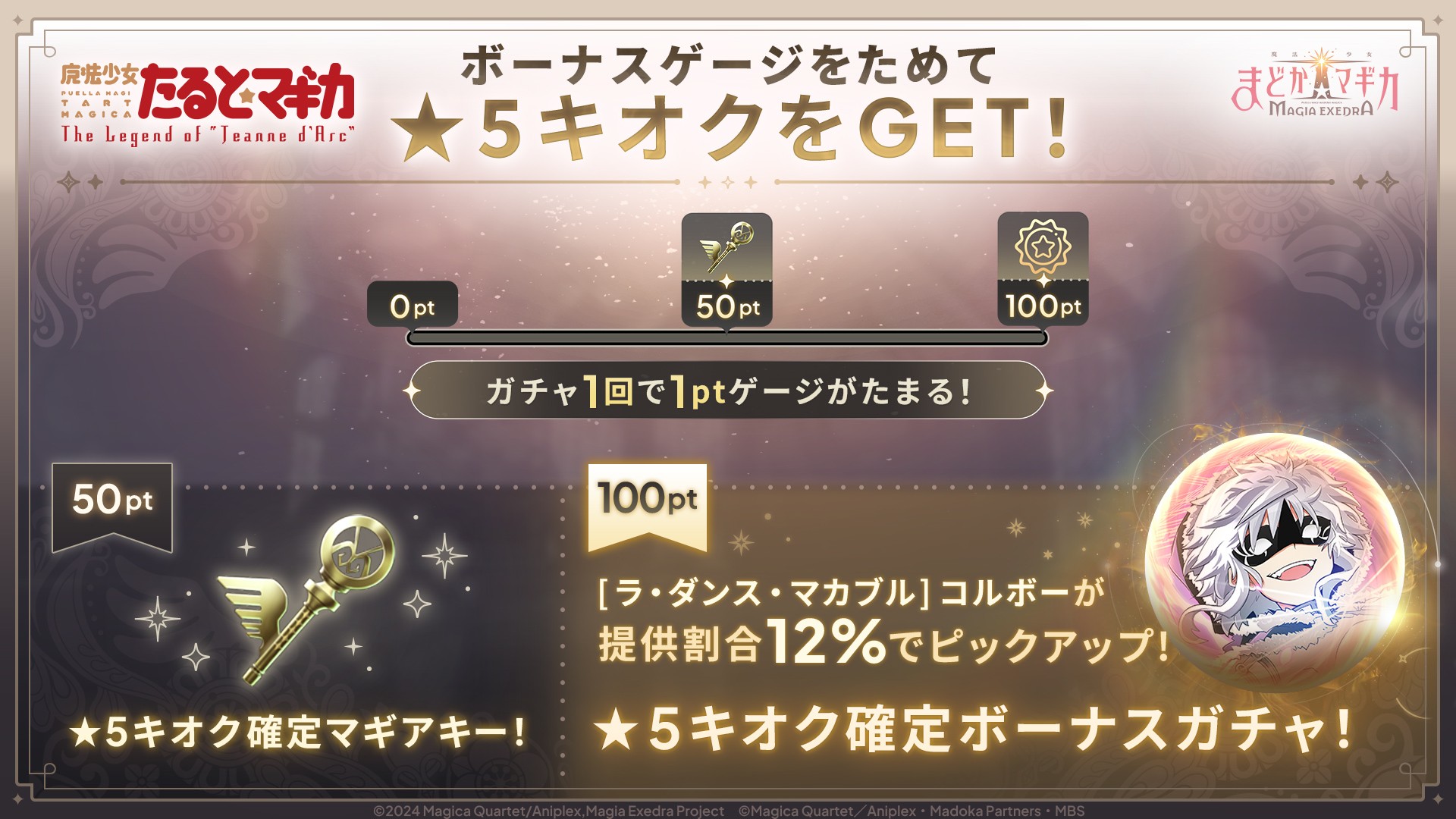 今回のガチャには「ボーナスゲージ」が付いており、ガチャ1回で1Ptゲージがたまります(10連ガチャで10Pt)。100Ptに達するとピックアップ対象も封入された★5キオク確定のボーナスガチャを1回引くことが可能です。