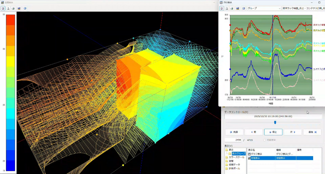 本ソリューションは、多数の温度センサから取得したデータを3Dカラーグラデーションで可視化します。時間軸に沿った温度変化を動画で確認できるため、サーバ負荷の増減に伴う温度分布の変化を視覚的に把握することが可能です。