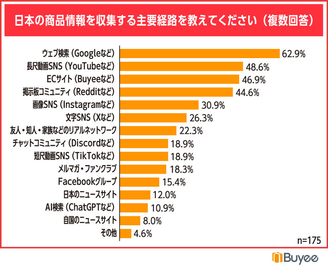 BEENOS株式会社(本社:東京都品川区、代表取締役:直井聖太、以下BEENOS)は、海外向け購入サポートサービス「Buyee(バイイー)」を利用される海外のお客様185名に「商品の情報収集に関する意識調査」を実施しました。本調査では、越境ECを利用する海外消費者が日本の商品をどこで見つけ、どのようなコミュニティを信頼しているのか、その実態を明らかにします。