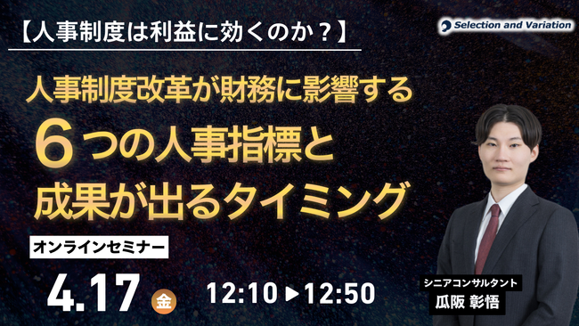 組織・人事コンサルティングファームであるセレクションアンドバリエーション株式会社(以下、当社、東京都千代田区丸の内、大阪市西区、名古屋市西区 / 代表取締役社長:平康慶浩/ URL:https://sele-vari.co.jp/ )は『【人事制度は利益に効くのか?】 人事制度改革が財務に影響する6つの人事指標と成果が出るタイミング』セミナーを2026年4月17日(金)12:10~12:50に開催することをお知らせいたします。
