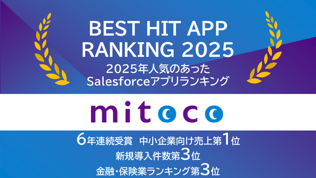 「mitoco(ミトコ)」は株式会社セールスフォース・ジャパンが公開した「2025年人気のあったAppExchangeアプリランキング」に6年連続で入賞し、中小企業向け売上ランキングで第1位、新規導入件数で第3位、業界別の金融・保険業ランキングで第3位に、それぞれランクインしました。