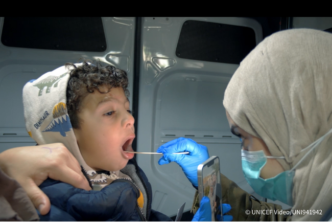 ヨルダン川西岸地区で、ユニセフが支援する移動式クリニックで診察を受ける男の子(パレスチナ、2026年2月9日撮影)(C) UNICEF Video/UNI941942 ※本文との直接の関係はありません