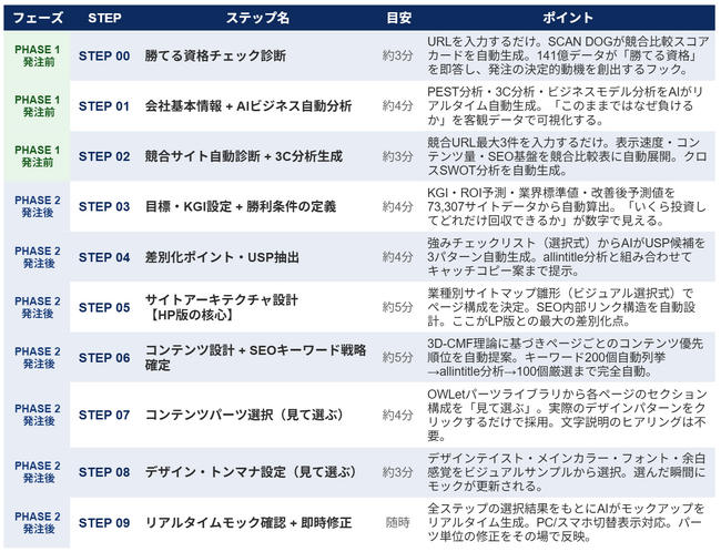 PHASE 1(発注前体験フェーズ:STEP 00~02) 合計約10分PHASE 2(発注後ヒアリングフェーズ:STEP 03~09) 合計約31分