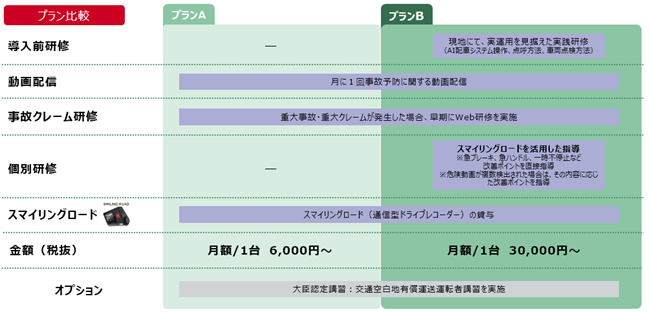・プランB:プランAに加え、システム操作や車両点検方法などの実践的な「導入前研修」や、「スマイリングロード」の運転スコアが低いドライバーへの個別指導を実施します。