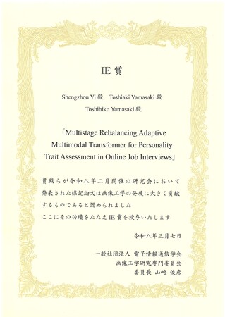 対話型AI面接サービスSHaiN(以下SHaiN)を開発・提供する株式会社タレントアンドアセスメント(本社:東京都港区、代表取締役:山崎俊明、以下、タレントアンドアセスメント)と、東京大学大学院情報理工学系研究科 山崎俊彦教授ら(Computer Vision and Media Lab)(以下、山崎研究室)による共同研究にもとづく論文が、一般社団法人 電子情報通信学会 画像工学研究専門委員会より、IE賞を受賞したことをお知らせします。本論文は、2026年2月に開催された画像工学研究会において発表されたものです。