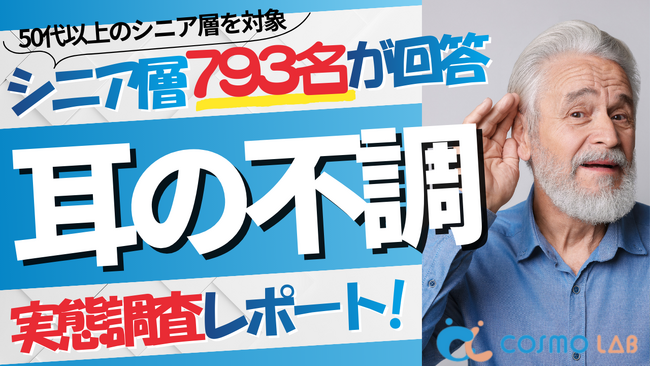 シニア専門のマーケティングプラットホーム コスモラボ(会社名:コスモヘルス株式会社、本社:東京都港区、代表取締役社長 小塚 崇史)がシニア層の『耳の不調』に関するアンケートリサーチのレポートをリリースしました。本レポートでは、50代以上のシニア層を対象に、聴力の低下や耳鳴りなど耳の不調に関するアンケート調査の結果をまとめました。不調の有無や聞こえの状態、自覚した時期や補聴器の利用状況などを整理しています。これらの結果をもとに、今後の情報提供やサービス設計を考える際のヒントを提供します。また、行動傾向や心理的なハードルにも触れながら、早めの対応につながる視点を探ります。