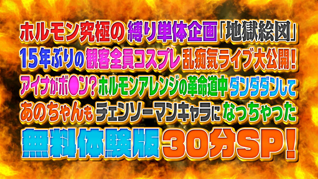 ■ABEMA『ホルモン究極の縛り単体企画「地獄絵図」15年ぶりの観客全員コスプレ乱痴気ライブ大公開!アイナがボ●ン?ホルモンアレンジの革命道中ダンダダンしてあのちゃんもチェンソーマンキャラになっちゃった無料体験版30分SP!』 放送概要