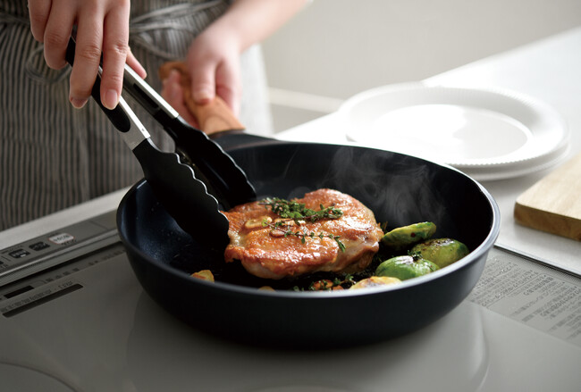 熱伝導性に優れるアルミニウム合金を使用し、さらに外側底面には蓄熱性が高い「鉄」を超高温で均一に一体化させる「鉄溶射加工」を施しています。このこだわりの構造により、食材を入れてもフライパンの温度が下がりにくく、お肉の旨みをしっかり閉じ込め、野菜炒めもシャキッと仕上げます。