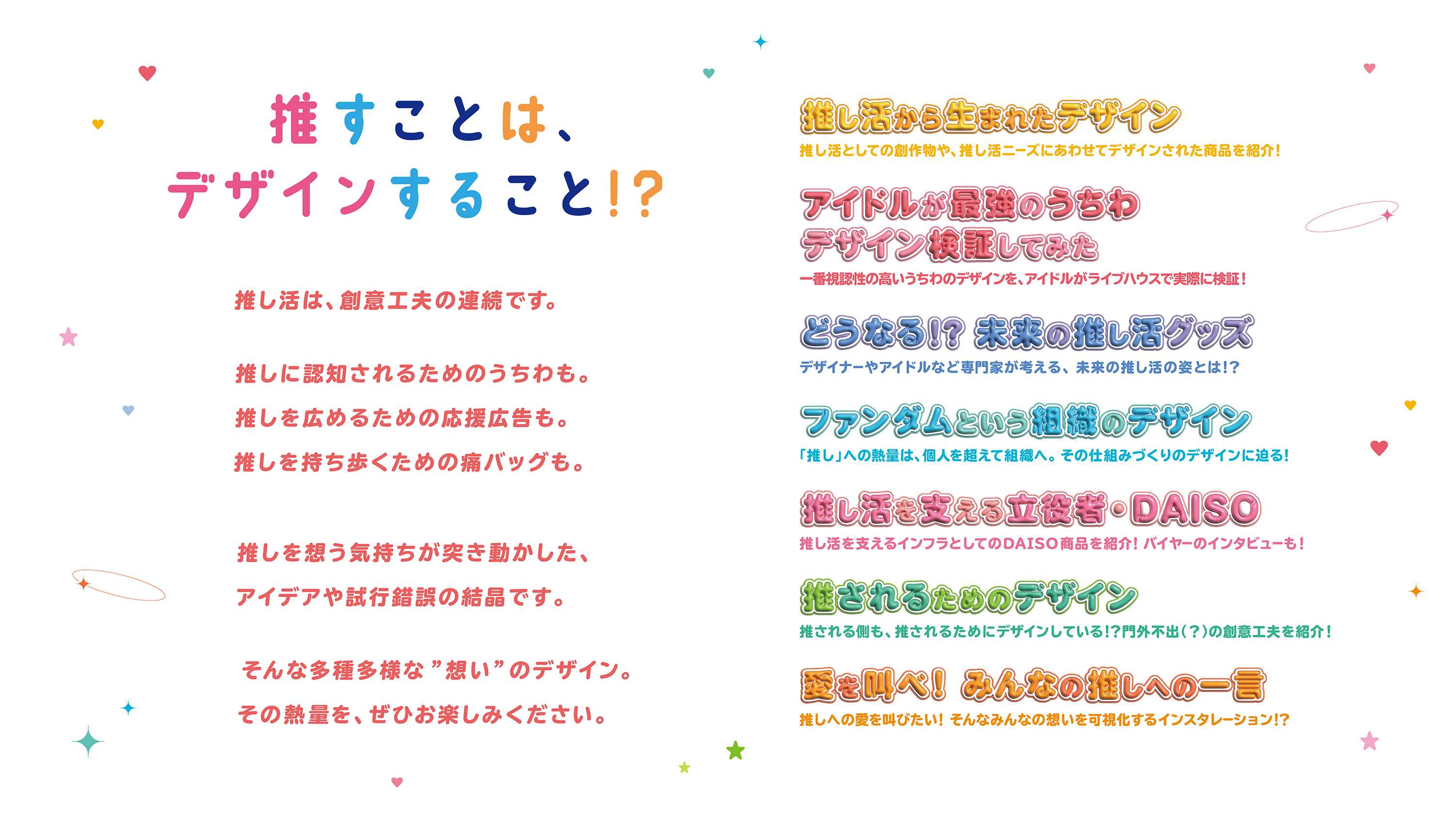 ライブに持参する自作のうちわ、推しの缶バッジを大量に装飾したバッグである「痛バッグ(痛バ)」、推しのグッズを飾りつける「祭壇」など、推し活が生んだデザインを実物で紹介するコーナーから、実際のアイドルとコラボしたコンテンツなど盛りだくさん。