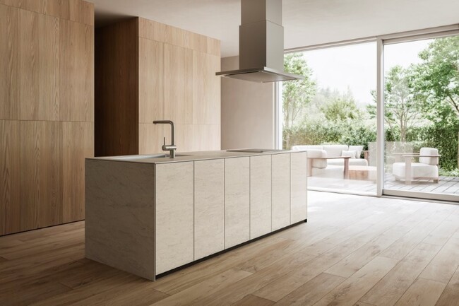 当社は、キッチンを起点とした空間全体のトータルコーディネートをさらに推進してまいります。2026年5月頃には、キッチンシリーズ《ジオーラ》と同一素材を用いたスラブタイル(超大判タイル)の単体販売を開始いたします。キッチンと同じ素材を背面の壁材や床材へも使用することで、より統一された空間が実現可能になります。