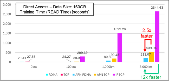 3,000kmの長距離環境であれば、APN+ RDMAアクセスでは、APN+TCPの約2.5倍、IP-VPN+TCPの約12倍もデータ転送の性能が向上