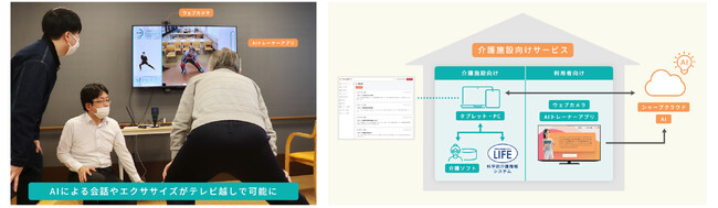 左:機能訓練の実施イメージ、右:「介護向けAIトレーナー」構成イメージ