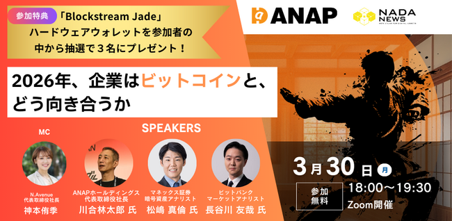 「2026年、企業はビットコインとどう向き合うか powered by ANAPホールディングス」を、2026年3月30日(月)に開催いたします。