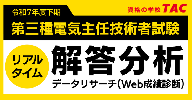 電気主任技術者講座(電験三種 / 電験二種)を展開しているTAC株式会社(東京都千代田区、代表取締役:多田敏男)は2026年3月22日(日)に実施される『令和7年度下期 第三種電気主任技術者試験』のリアルタイム解答分析(Web成績診断)を実施します。さらにTAC講師陣による試験講評も順次公開!どなたでも参加いただけます。[画像1: https://prcdn.freetls.fastly.net/release_image/21078/2145/21078-2145-45d8ea726c36621216a47713869fa577-800x418.png?width=536&quality=85%2C75&format=jpeg&auto=webp&fit=bounds&bg-color=fff ]