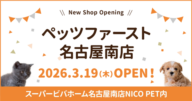 “Pets always come first”を理念に掲げるペッツファーストホールディングス株式会社(本社:東京都目⿊区、代表取締役:坂本晴彦、以下 当社グループ)は、アークランズ株式会社(本社:新潟県三条市、社長:佐藤好文、以下 アークランズ)が運営する「NICO PET名古屋南店」内にペットショップ『P’s-first名古屋南店』を2026年3月19日(木)にオープンいたします。