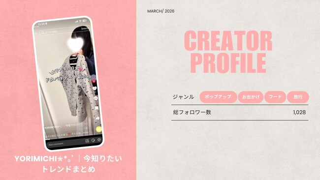 「YORIMICHI|今知りたいトレンドまとめ」は、おでかけスポットや新作スイーツを中心に取材を行い、動画の制作・発信を行っています。これまでの投稿の中には、再生回数34万回を超えるものもあります。トレンド分野に強みを持つ同メディアの加盟により、最新商品の認知拡大やイベント・おでかけスポットへの来場促進が期待できます。