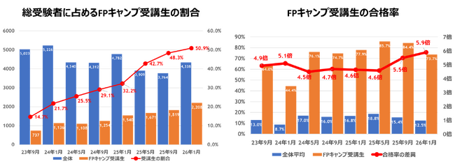 【FPキャンプ】FP1級学科試験に占める受講生割合は51%、合格率は全体の5.9倍の74%/受験生全体に占めるFPキャンプ受講生の割合が初めて5割を突破