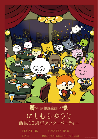 2026年4月15日(水)~5月10日(日)の期間限定で、横浜・みなとみらい、ランドマークプラザ5階にある「Cafe Fan Base(カフェ ファンベース)」にて、コラボカフェ『広報課企画 にしむらゆうじ活動10周年 アフターパーティー』を開催いたします。