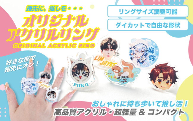 [画像2: https://prcdn.freetls.fastly.net/release_image/60781/38/60781-38-b3bb245db451e0214777a5a1256ffced-1080x680.jpg?width=536&quality=85%2C75&format=jpeg&auto=webp&fit=bounds&bg-color=fff ]オリジナル アクリルリング(指輪)は、指先という視認性の高い場所で推しを楽しめる、新しいトレンドアクセサリーです。写真や動画撮影時にも自然とフレームに入りやすいため、SNS投稿との相性も抜群。日常のワンシーンでもさりげなく“推し”をアピールでき、世界観のあるひと時を演出します。イベント物販やキャンペーン施策にも効果的な、話題を呼ぶアイテムです。