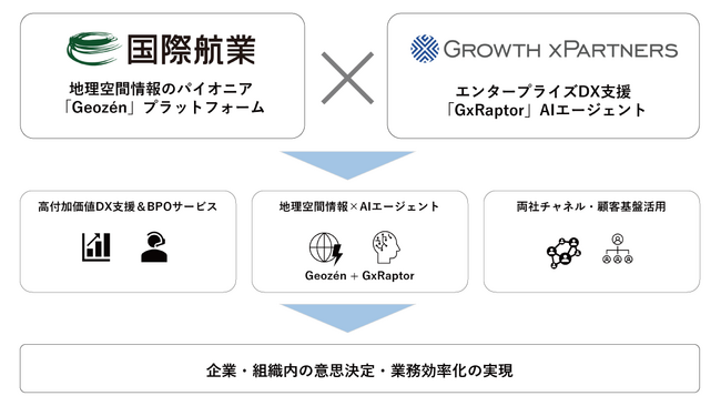 国際航業株式会社(本社:東京都新宿区、代表取締役社長:藤原 協、以下「国際航業」)とグロースエクスパートナーズ株式会社(本社:東京都新宿区、代表取締役社長:渡邉伸一、以下 GxP)は、国際航業の地理空間情報利活用のためのプラットフォーム製品「Geozen(ジオゼン)」を中核としたエンタープライズ企業のDX支援事業の拡大を目的に、業務提携に向けた協議検討をすることで合意したことをお知らせします。