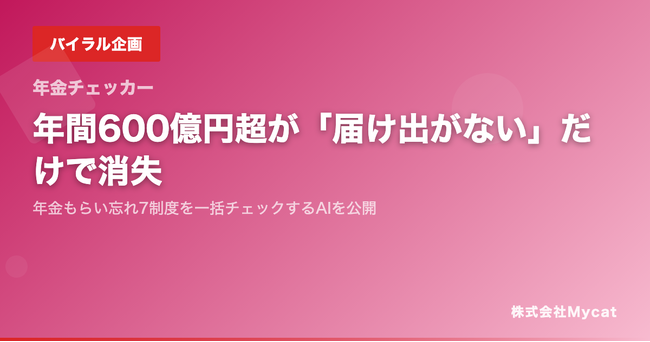 株式会社Mycatは、この届出漏れリスクを解消するため「年金もらい忘れ一括チェックAI」を新たに公開した。- 7制度一括スキャン: 年齢・家族構成・就労状況など8項目を入力するだけで、該当可能性のある制度を一覧表示