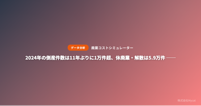 株式会社Mycat(本社:東京都目黒区)は、廃業費用の比較シミュレーションツール「廃業コストシミュレーター」(https://haigyo.xyz)において、公的統計に基づく廃業コストの実態分析レポートを新たに公開いたしました。倒産件数は過去最多水準、休廃業・解散も高止まり