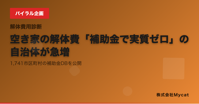 株式会社Mycatは、全国1,741市区町村の空き家解体に関する補助金情報を横断検索できる「解体補助金データベース」を解体費用(https://kaitai.xyz)に新たに公開しました。