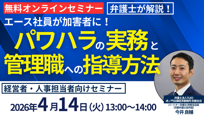「エース社員が加害者に!パワハラの実務と管理職への指導方法」セミナーを無料・オンラインセミナーにて開催いたします。