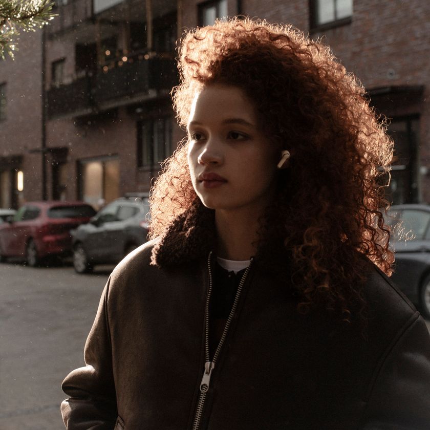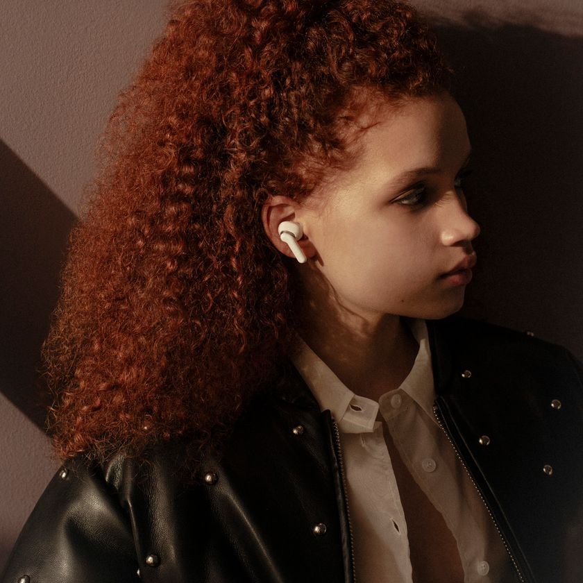 Sudio E4 Pro クラウディホワイト モデル着用画像 屋外の環境音がある状況での使用もクリアな通話品質