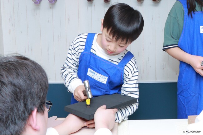 4年目を迎える今年も、体験の内容は本格的。こども達は、こども達はランドセルの歴史や各パーツの役割、ミニランドセルに使う素材・道具について学んだ後、実際の製作工程に挑みます。実際の職人が使う工具で、革にパーツ(カシメやナスカン)を打ち込む作業や、内装材(樹脂版)の丁寧な貼り合わせなど、一つひとつの工程に妥協は許されません。