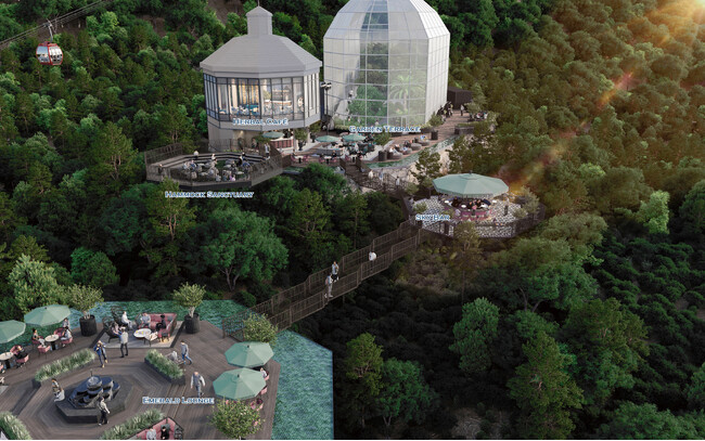 ■既存テラスを「ガーデンテラス」として改修・拡張し、さらには、正八角形の3つの新スポット「エメラルド ラウンジ」「スカイバー」「ハンモック サンクチュアリ」が有機的に森の中に浮かぶように配置されています。