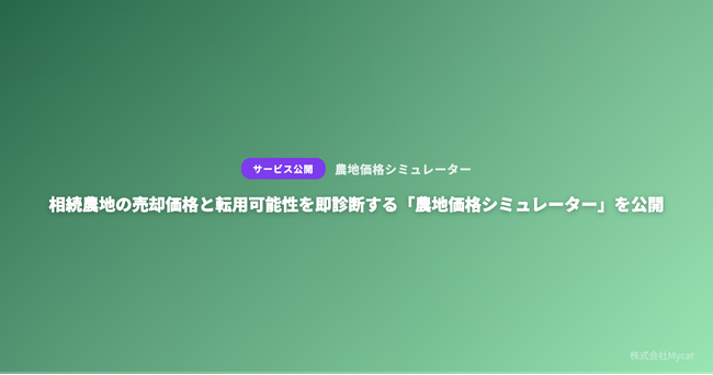 株式会社Mycat(本社:東京都目黒区)は、都道府県・地目(田/畑)・面積を入力するだけで農地の売却相場と転用可能性を即時に診断できるWebサービス「農地価格シミュレーター」(https://nouchi.xyz)を公開いたします。背景:「相続した農地をどうすればいいかわからない」