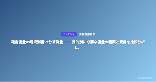 株式会社Mycat(本社:東京都目黒区)は、測量費用診断(https://sokuryo.xyz)において、利用者の目的に応じた測量種別の自動判定機能を追加したことをお知らせいたします。あわせて、日本土地家屋調査士会連合会の報酬統計をもとに、3種類の測量の違いと費用を整理しました。測量には3つの種類がある