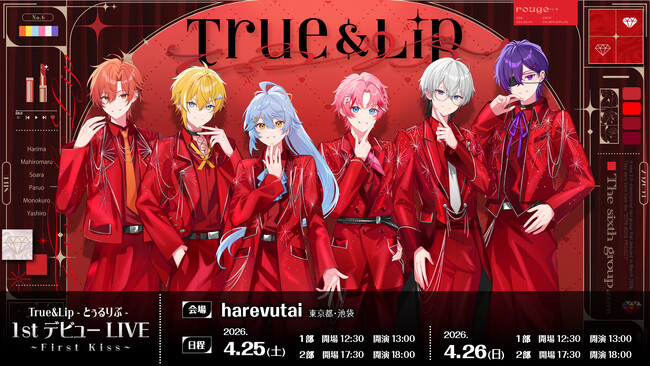 『True&Lip - とぅるりぷ - 1st デビュー LIVE ~First Kiss~』は、2026年4月25日(土)・26日(日)にharevutaiにて開催いたします。チケットは、2026年3月21日(土)19:00よりFC最速先行受付を開始いたしました。