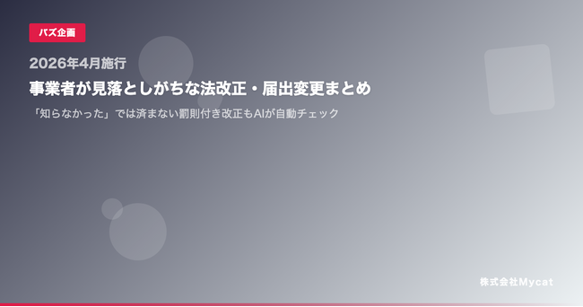 株式会社Mycat(本社:東京都目黒区)が運営するAI許認可ガイドサービス「許認可ナビ」(https://kyoninka.xyz)は、2026年4月に施行される事業者向けの法改正・届出変更を独自に集計し、業種別の対応ポイントをまとめたレポートを公開しました。