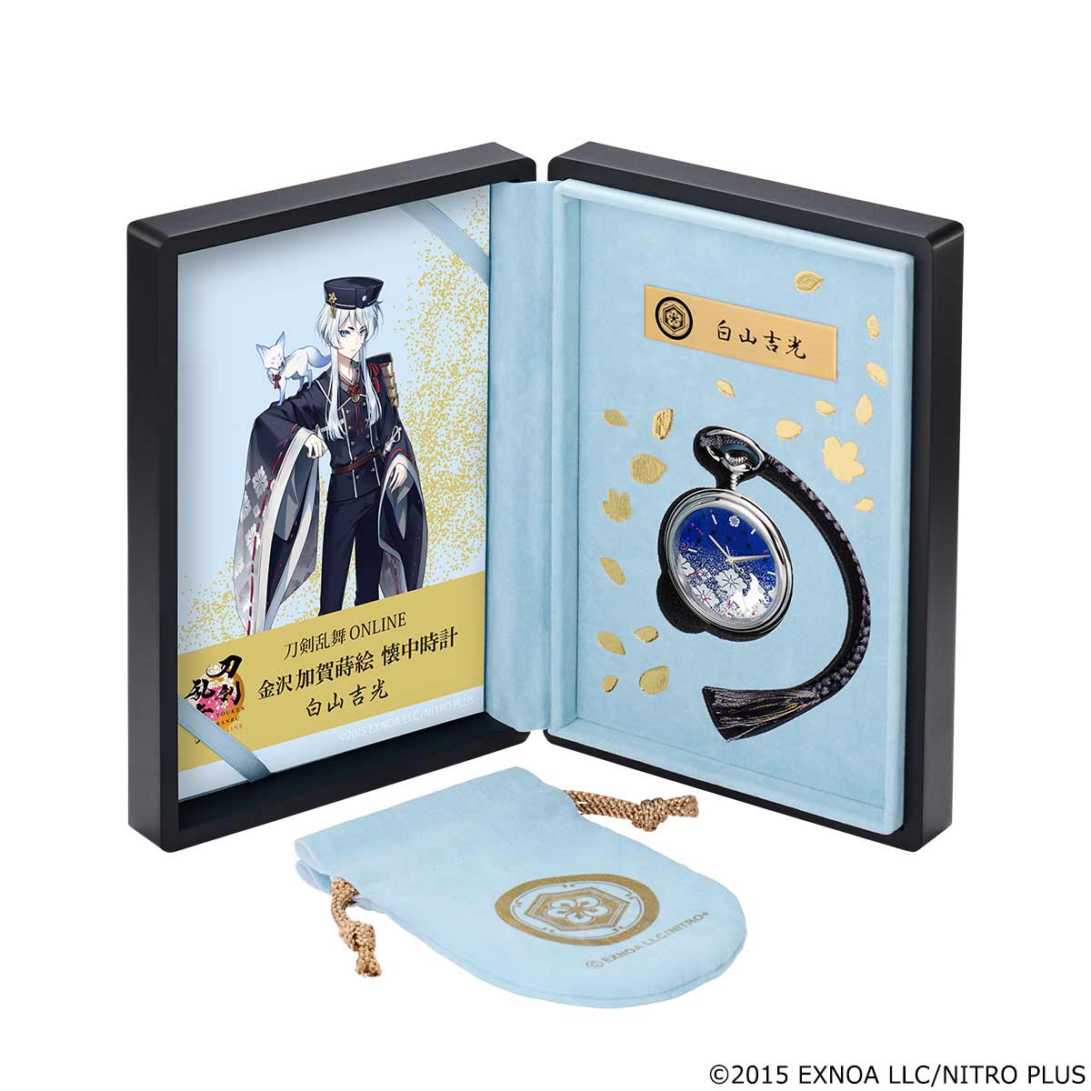ケースの内装は白山吉光をイメージしたカラー。金色の箔押しであしらわれた桜吹雪が華やぎを添えています。懐中時計に合わせた特注カラーの組紐と、刀剣男士紋入りの巾着袋が付属します。