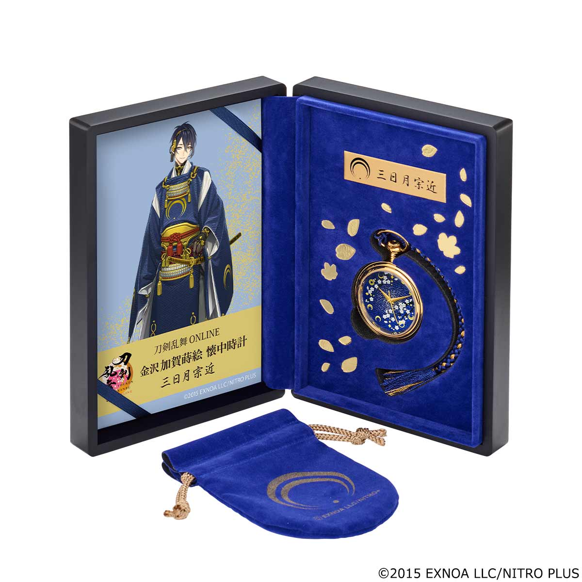 ケースの内装は三日月宗近をイメージしたカラー。金色の箔押しであしらわれた桜吹雪が華やぎを添えています。懐中時計に合わせた特注カラーの組紐と、刀剣男士紋入りの巾着袋が付属します。