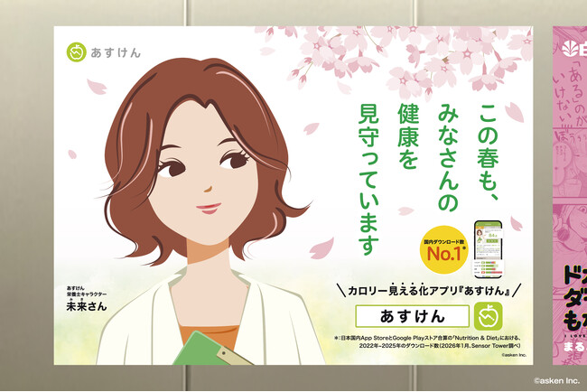 累計会員数1,300万人超・国内No.1*¹のAI食事管理アプリ『あすけん』の開発・運営を行う株式会社asken(東京都新宿区、代表取締役社長 中島洋、以下「当社」)は、『あすけん』の栄養士キャラクター「未来さん」が新生活を迎えるみなさまへエールを送る駅構内OOH広告「未来さんの新生活応援広告」を、2026年3月23日(月)~3月29日(日)の期間、東急東横線・東急田園都市線渋谷駅に掲出します。