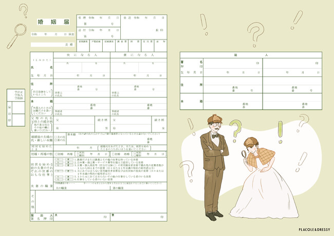 探偵の格好をしたふたりが描かれた、謎解き好きなお二人にぴったりの婚姻届。 嬉しい出来事も、ちょっとしたハプニングも、すべてを一緒に解き明かしていく――そんな探偵気分を楽しめる遊び心あふれるデザインです。