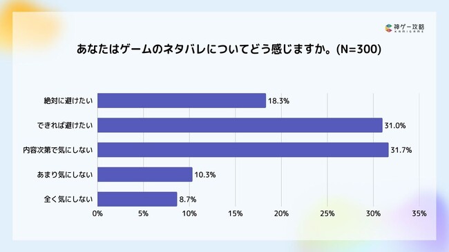 「ゲームのネタバレについてどう感じるか」を尋ねたところ、「絶対に避けたい(18.3%)」「できれば避けたい(31%)」を合わせ、49.3%がネタバレを避けたいと考えていることが分かりました。