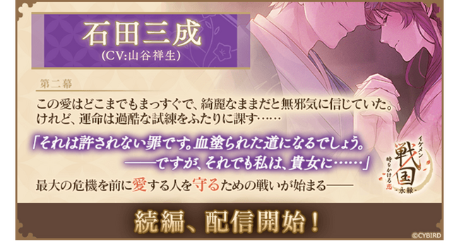 株式会社サイバード(本社:東京都品川区、代表取締役社長 兼 CEO 長嶋 貴之)が手掛ける、全世界でのシリーズ累計会員数4,500万人を誇る大人気恋愛ゲーム「イケメンシリーズ」の最新作『イケメン戦国 時をかける恋 -永縁-(読み:えいえん)』(以下、『イケメン戦国 -永縁-』)は、「石田三成(CV:山谷 祥生)」(以下、「石田三成」)の続編ストーリーを2026年3月23日(月)12時より、配信を開始しました。