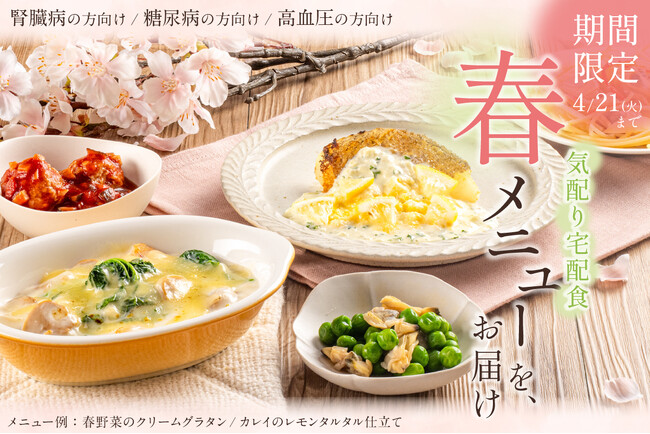 糖尿病や腎臓病、高血圧など生活習慣病をお持ちの方でも、季節感のある食事を安心して楽しんでいただきたい。そんな想いから、冷凍宅配食を展開するウェルネスダイニング株式会社(本社:東京都墨田区、代表取締役:中本哲宏)は、春の食材や彩りを取り入れた「春限定メニュー7種」を期間限定で発売いたします。